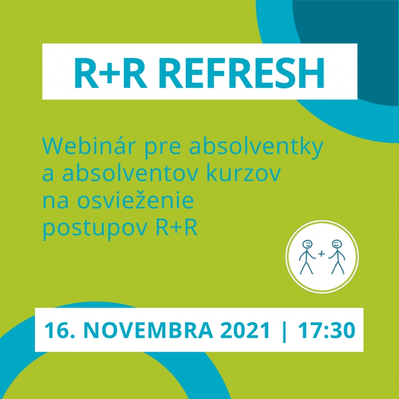 Spolu si osviežime postupy konceptu R+R, popremýšľame nad konkrétnymi situáciami, s ktorými sa stretávame a vzájomne sa povzbudíme a podporíme v hľadaní odpovedí. Tešíme sa na vás 16. novembra 2021.